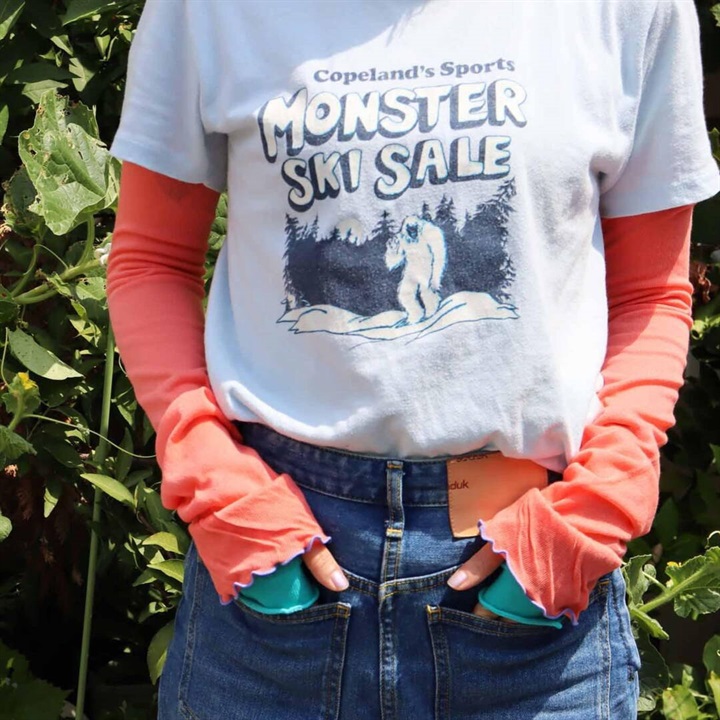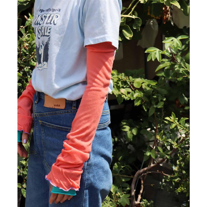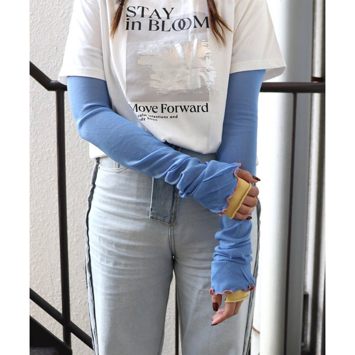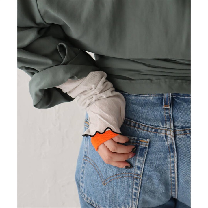 袖口のフリルとレイヤードっぽいデザインがおしゃれなアームカバー。薄地で涼しく、日焼け対策はもちろんのこと、Tシャツと重ねるだけでおしゃれな着こなしに。フェスやBBQにもおすすめ!夏を楽しみたい方におすすめです♪
