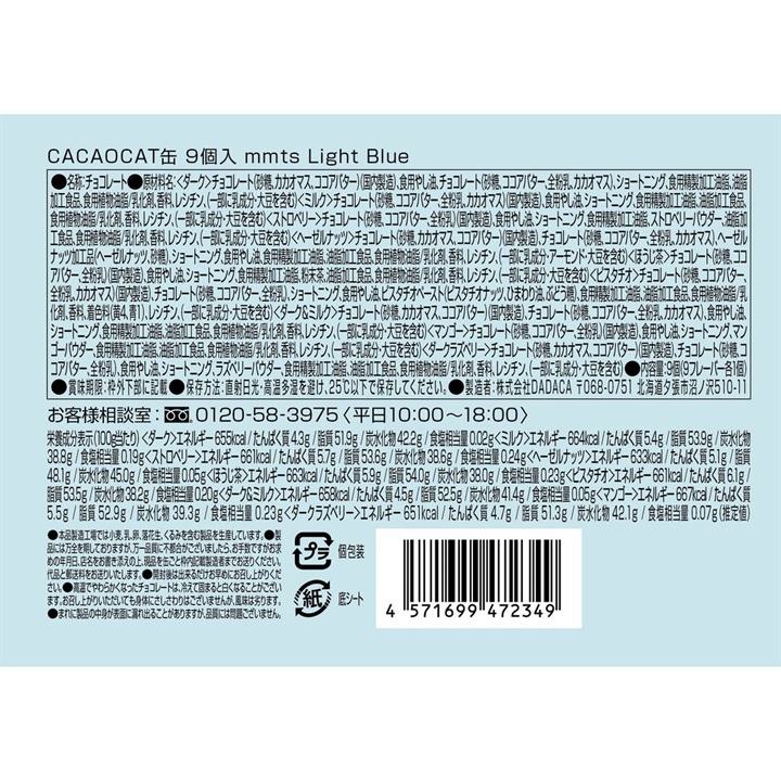 4種の猫の柄の缶に、CACAOCATを9個入れたセット。