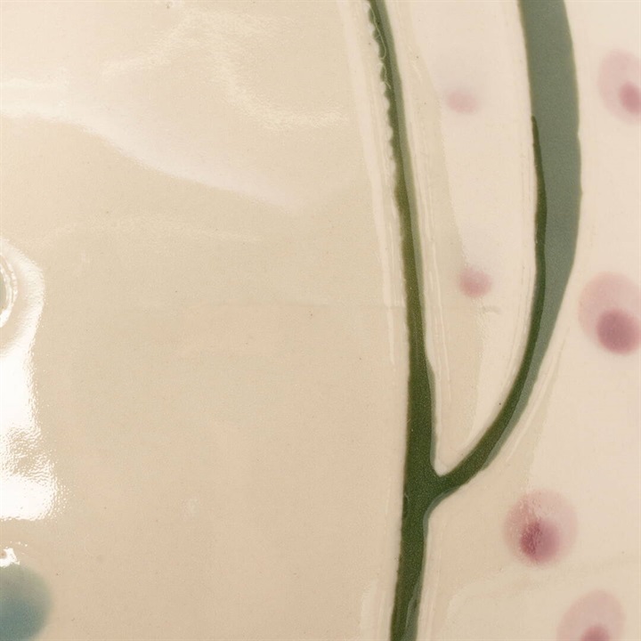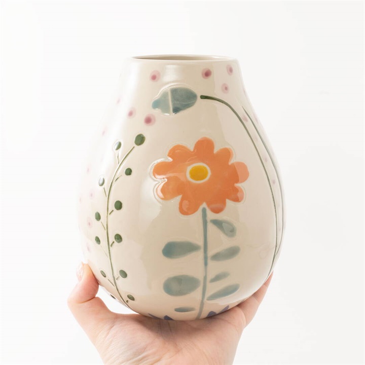 カラフルな花柄が素敵なフラワーベース。色合いの美しい花柄が手描きされており、温かみのあるアイテムです。花器としても、家の装飾要素としてもぴったりです。