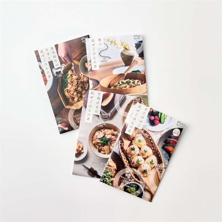 - セット内容:若鶏の五目混ぜごはんの素、黒毛和牛の牛すじ混ぜごはんの素、鱧の混ぜごはんの素、京たけのこ混ぜごはんの素(各1個)