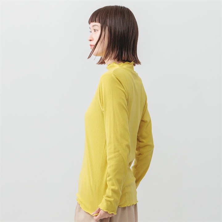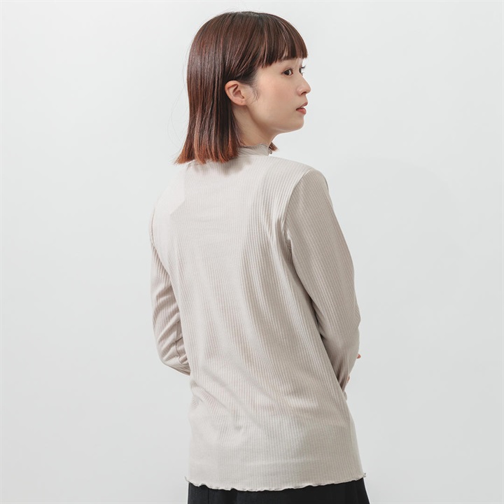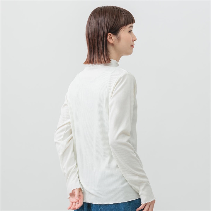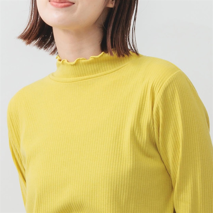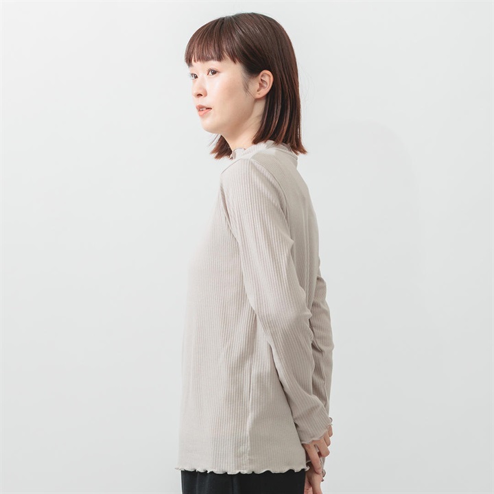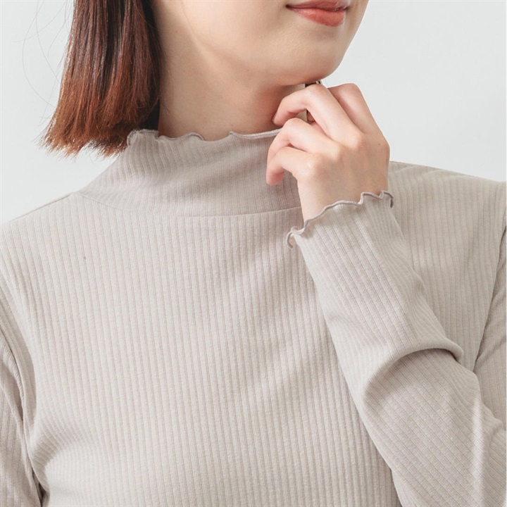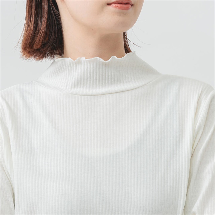 伸縮性があり、体に優しくフィットしてくれます。メローフリルがコーディネートのアクセントにちょうど良い一枚。ハイネックは、気になる首元を自然にカバーしてくれます。