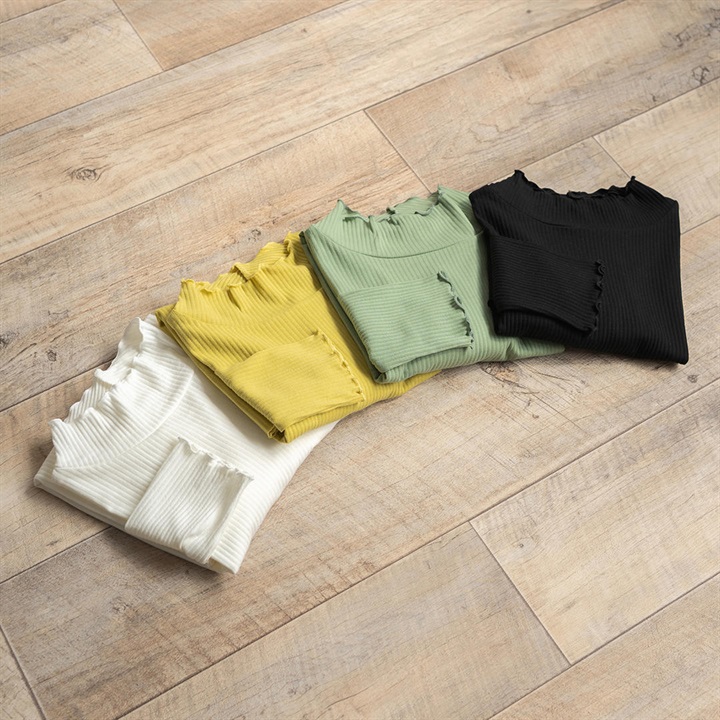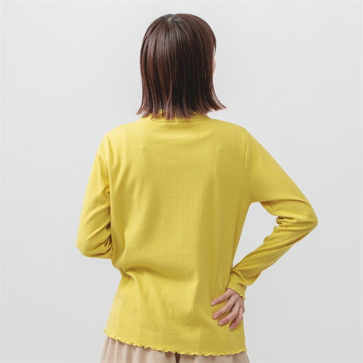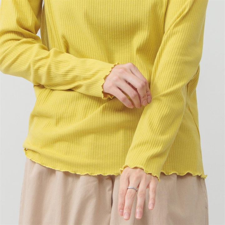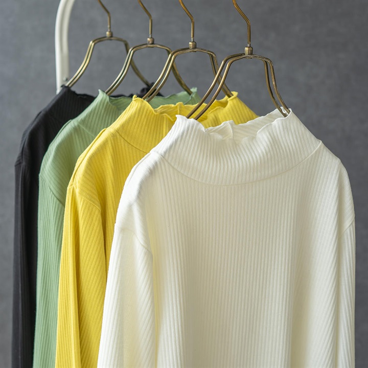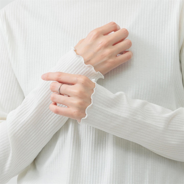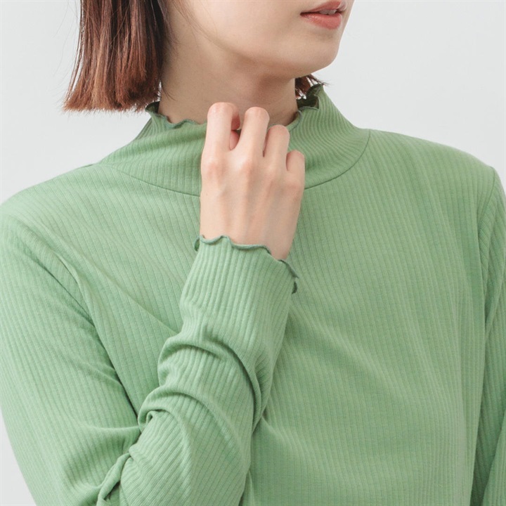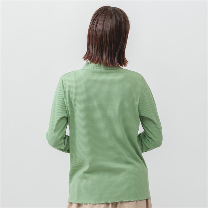 伸縮性があり、体に優しくフィットしてくれます。メローフリルがコーディネートのアクセントにちょうど良い一枚。ハイネックは、気になる首元を自然にカバーしてくれます。