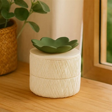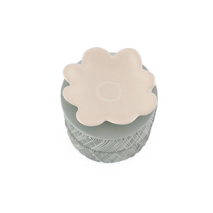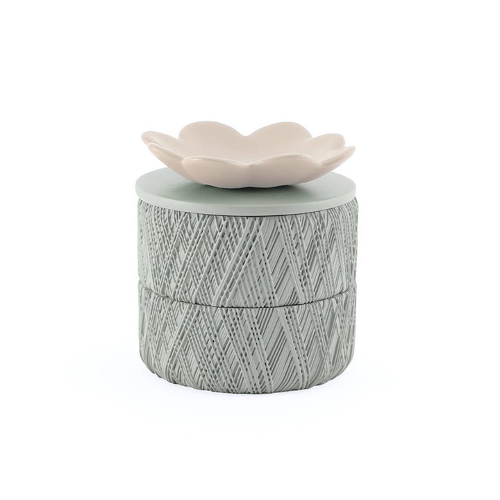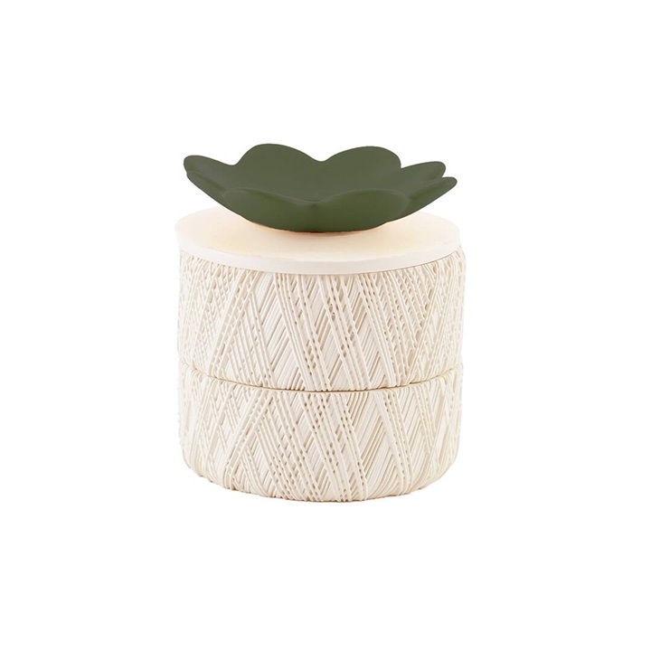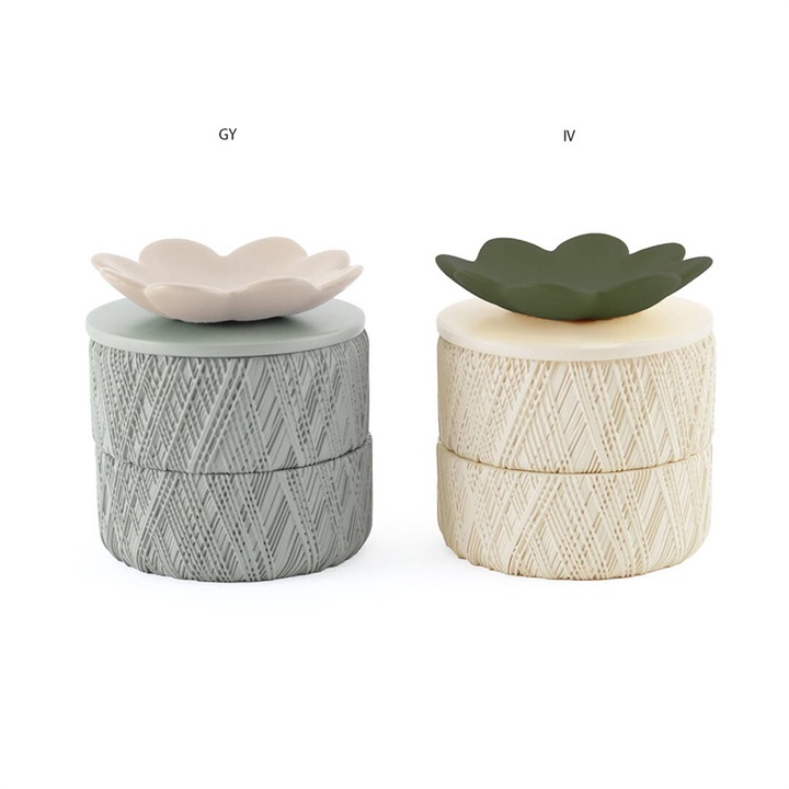 お花モチーフの2段アクセサリーケース。蓋のお花には使用頻度の高いアクセサリーを置いたり、ディスプレイトレイとしてもお使いいただけます。本体の側面には、糸巻きを思わせる凹凸模様が施されており、光を受けることで柔らかな陰影が生まれる、表情豊かなデザインが特徴です。またデザインボックス入りでプレゼントにもおすすめです。 ▼プレゼント用のラッピングバッグはこちら
