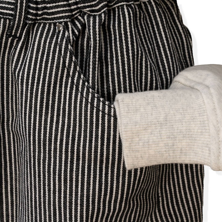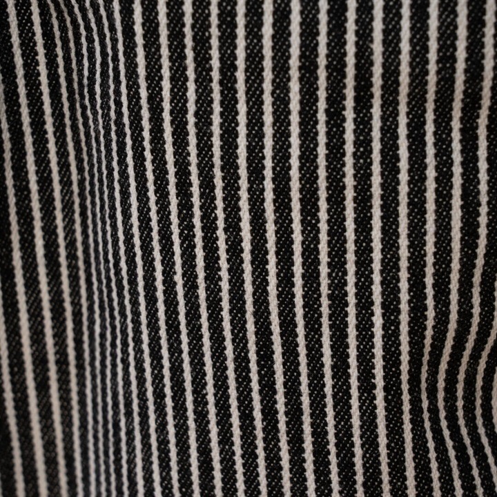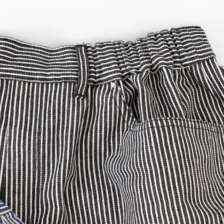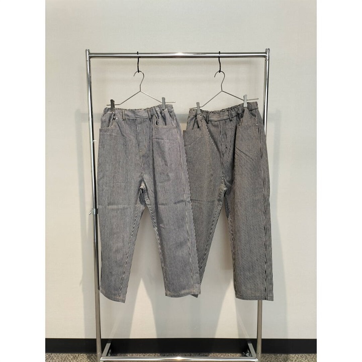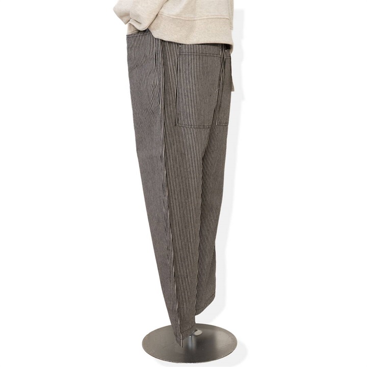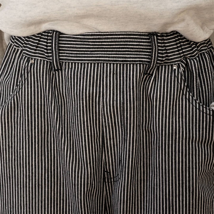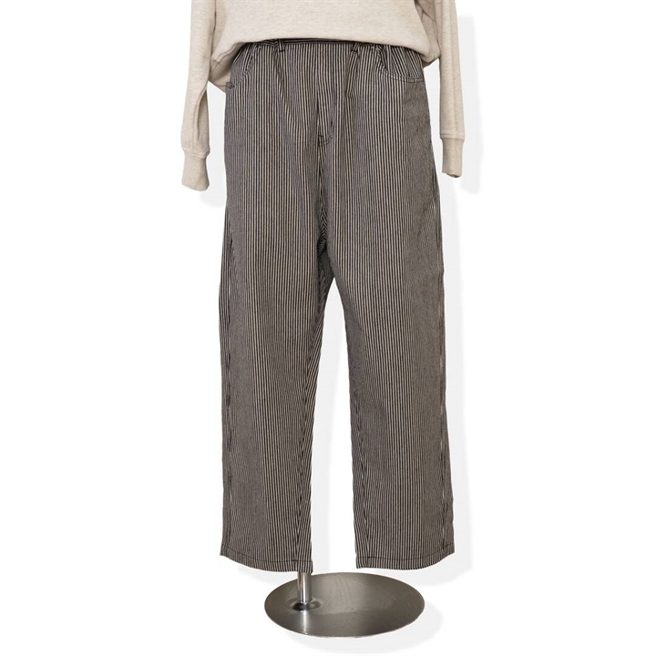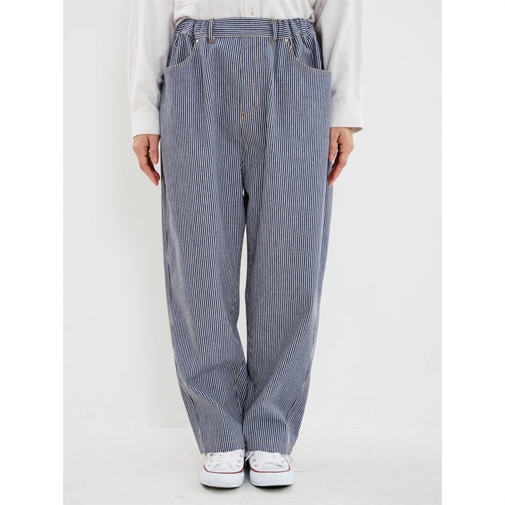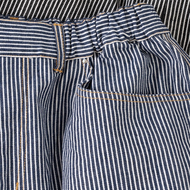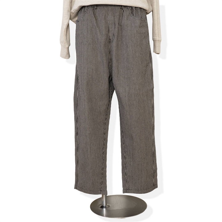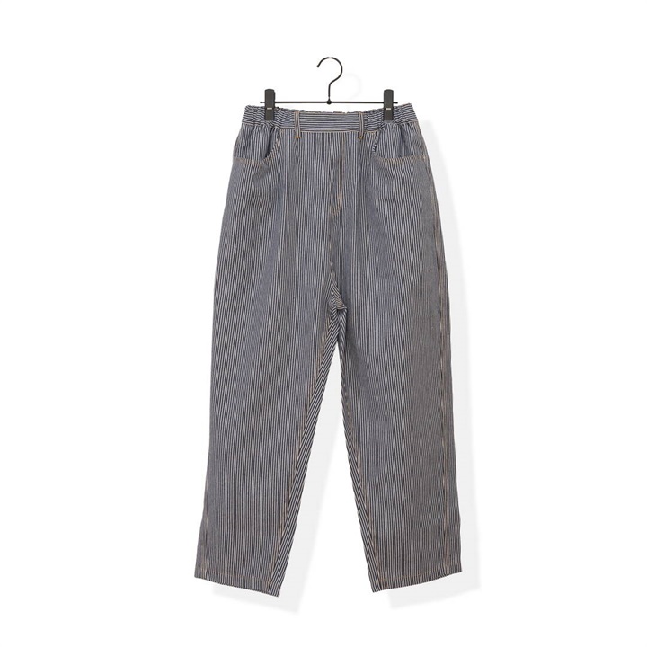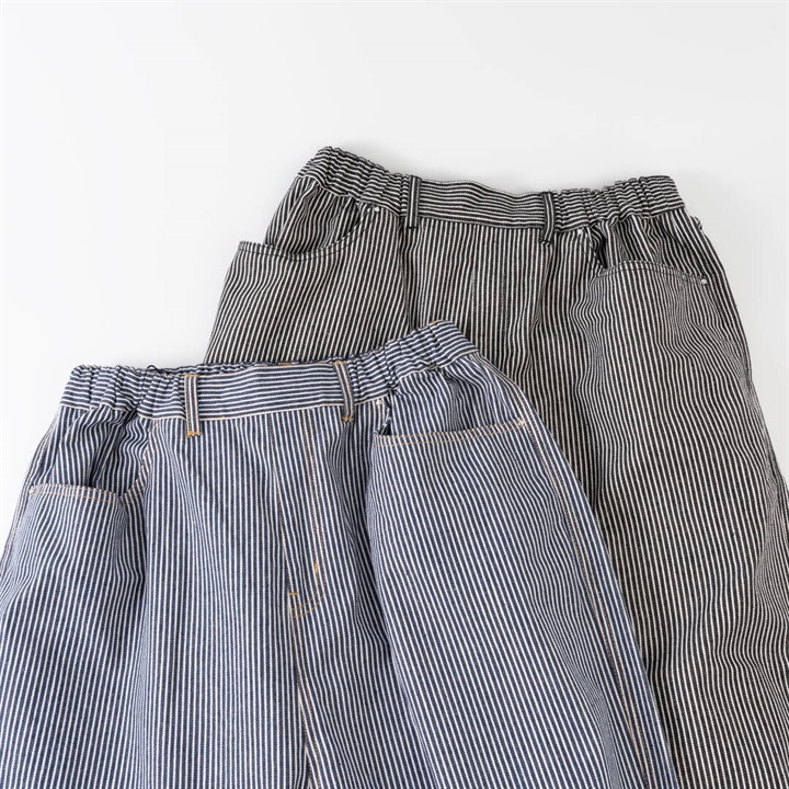 ロングシーズン活躍するヒッコリーストライプパンツ。しっかりとした生地感ですが、ラフに穿けるリラックスシルエット。ウエストはゴム仕様で脱着も楽ちん、ストレスフリー。後ろポケットから出たフラッシャーもポイントです◎