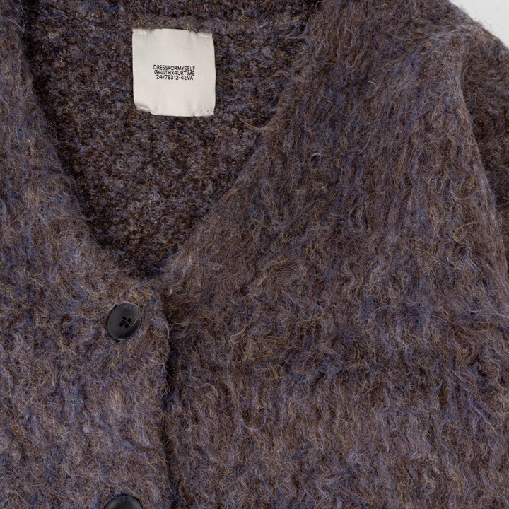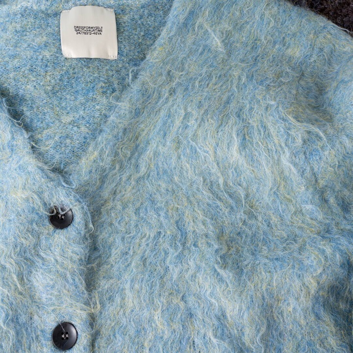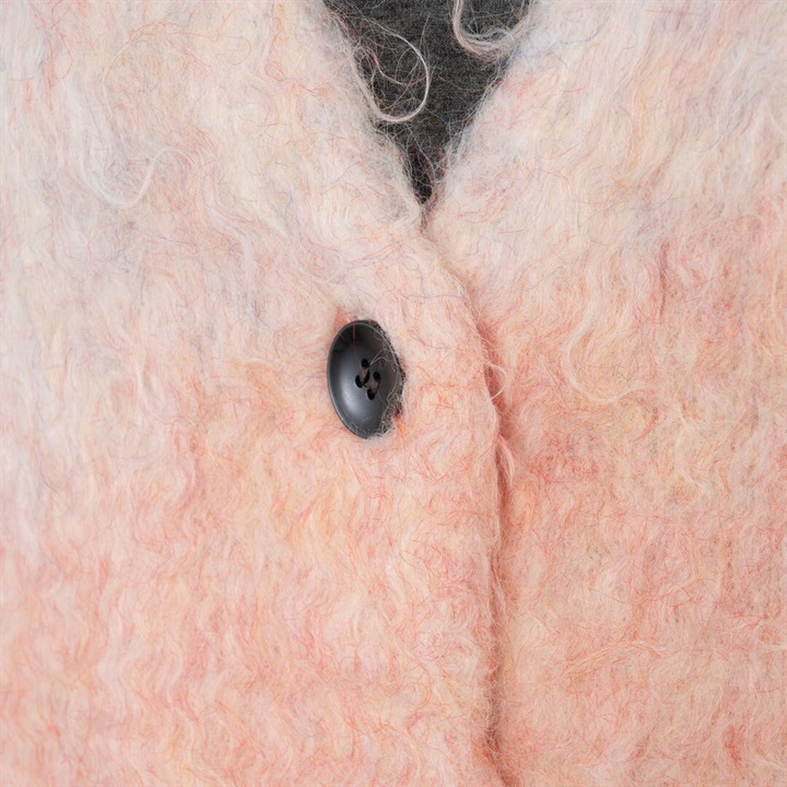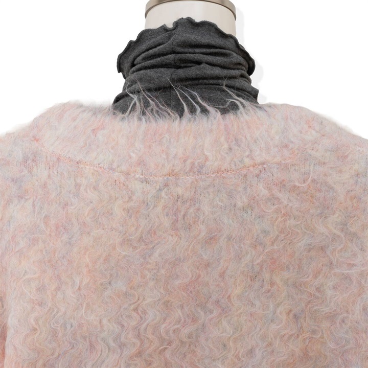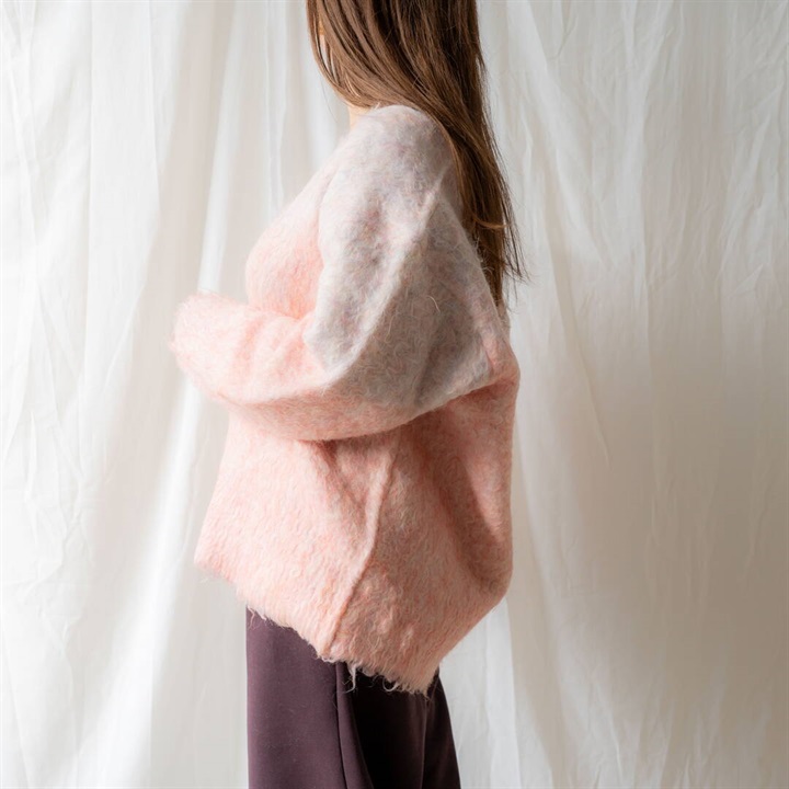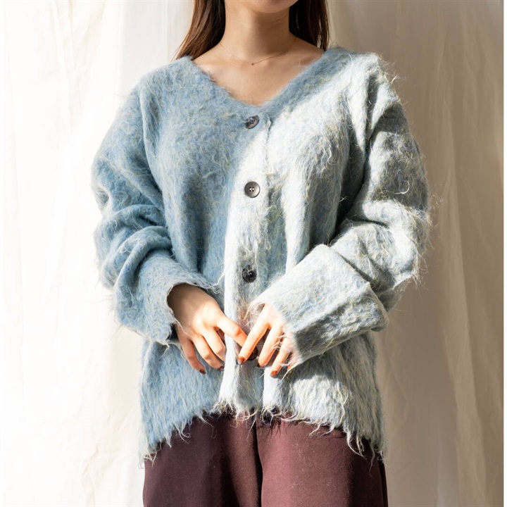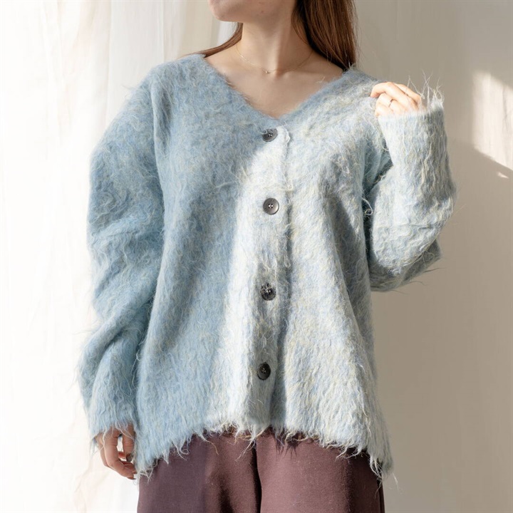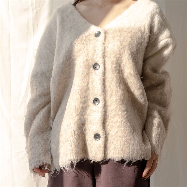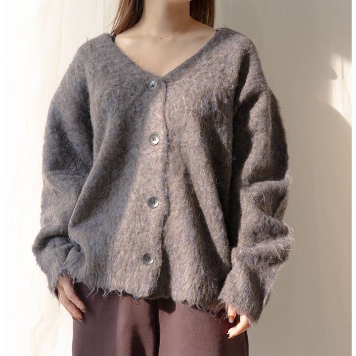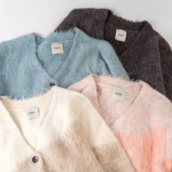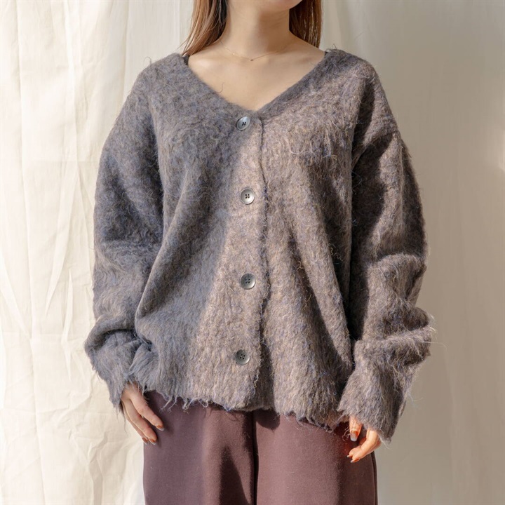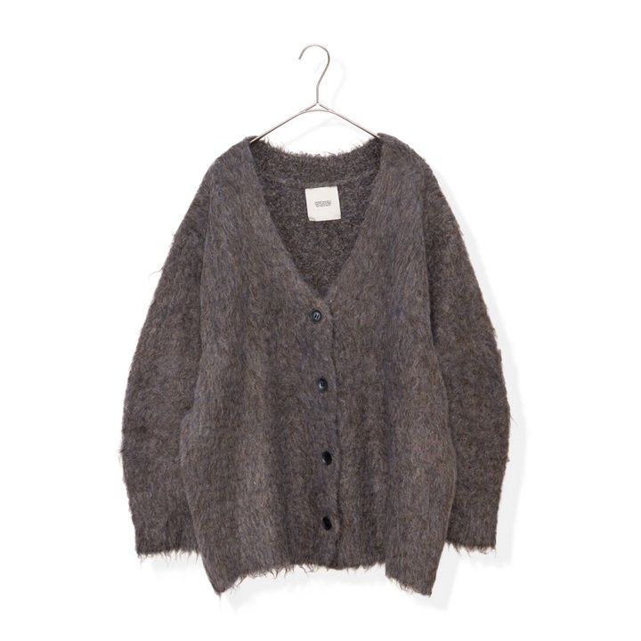 ツートーンカラーと、ニュアンスある単色カラーが可愛い4色展開。パーツの状態で特殊起毛をかけ、水洗いをしてからリンキングする方法で、とても手が掛かっているアイテム。袖のラインは減らしを入れカーブにすることで立体的に。背裏ラベルもつけ、アウターよりのボリュームカーデになっています。オーバーめのサイズ感なので厚めのインナーも着込めちゃいます。タンクと合わせてヘルシーに着たり、釦を開けてロゴTと合わせても◎
